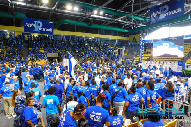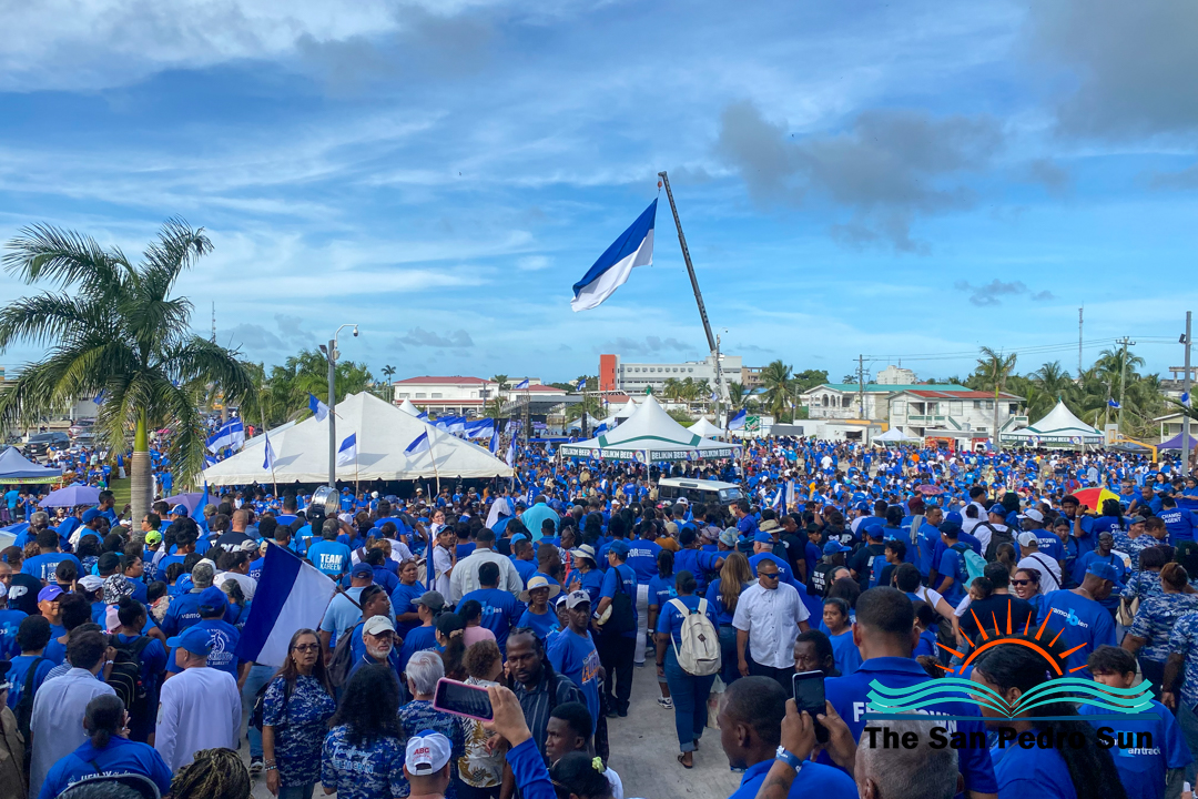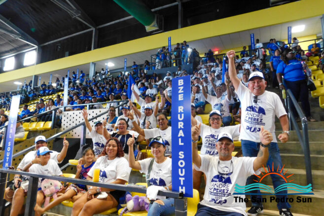 Inside, the crowd stood in support of their standard bearers, holding posters and banners. Belize Rural South (BRS), which includes the Cayes—Caye Caulker and Ambergris Caye—was among the constituencies represented. Standard bearer Andre Perez was accompanied by a large group of islanders at the national convention.