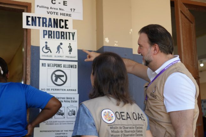 The OAS/EOM observed voting in 12 out of 29 contested divisions and reported that the process was smooth and orderly. Polling stations opened on time and were well-equipped, primarily staffed by competent women election workers. Voters generally faced few issues when casting their ballots, although some polling stations were inaccessible to individuals with disabilities. The mission also noted instances of campaign activity near polling stations, which could intimidate voters, and reports of incentives being offered to voters—practices it criticized for undermining democratic values.