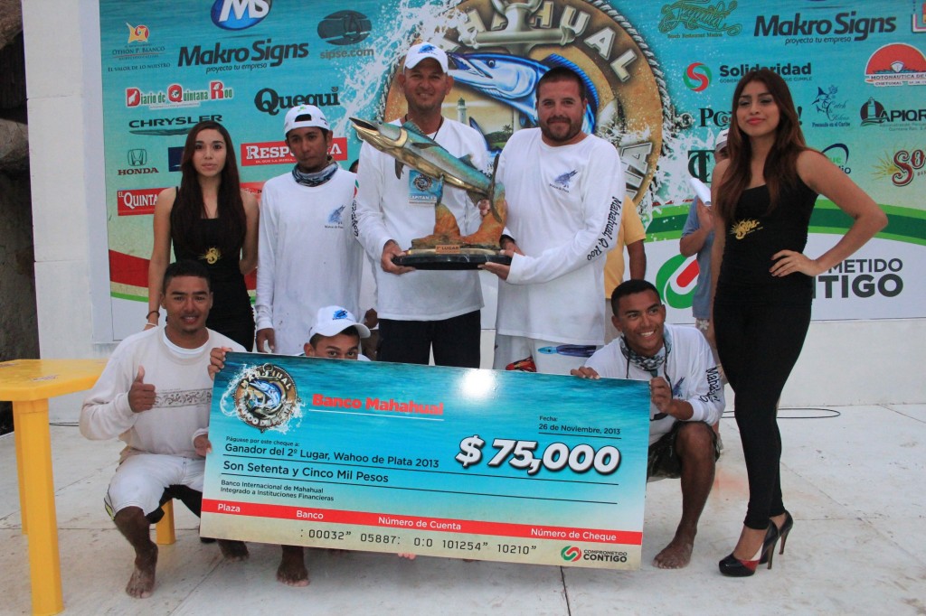 47 Wahoo Tournament Mahahual - El Diario de Quintana Roo (5)Coming in first at the second annual Tequila Beach Resort Wahoo fishing tournament was MMM Que Tiene, captained by Mexican Azael Jimenez, who managed to capture a total of 588.5 points. The first place team took home a trophy and a 2013 pickup truck. Johnny Quest, captained by Belizean Michael Hancock, took second place with 285 points. The Belizean team took home $75,000 Pesos (Bze $11,397.94) in cash. Third place went to La Doña, captained by Mexican Zafra Perez, with 282 points. They took home a 17-foot skiff. Fourth place went to Seas Star, captained by Miguel Marzuca. With 234 points total, they took home a motorcycle.