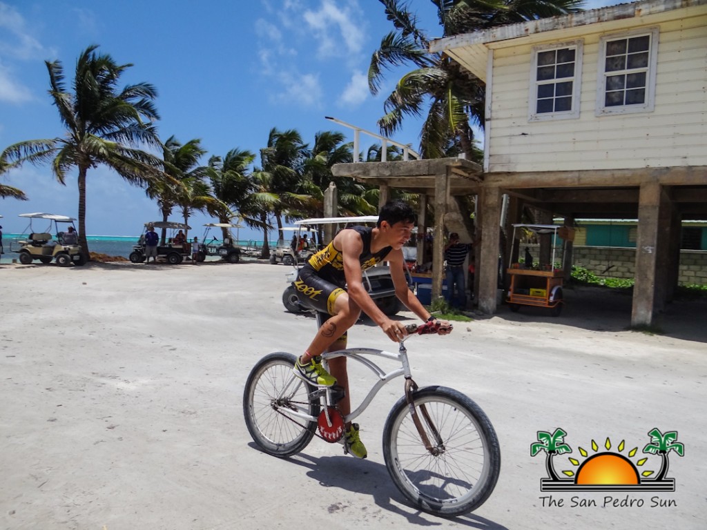 In the juvenile category, 12 boys under the age of 12 tested themselves in the arduous race. The young athletes had to swim about 20 yards in the Boca Del Rio channel, then race to their bicycles at the entrance of the park. The boys then cycled one mile up the Northern Ambergris Caye Road and back. This was followed by a run to Ocean Tide Beach Hotel and back to the Boca Del Rio Park. Taking first place with a time of 12 minutes and 15 seconds was Michael Cobo. In a close second was Michael’s brother, Adrian Cobo. Josue Valle finished off in third, with Leroy Arzu taking fourth, while Cameron Zetina rounded up the top five.