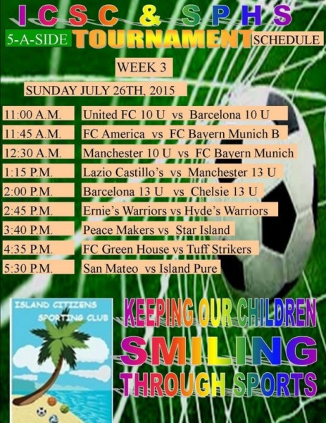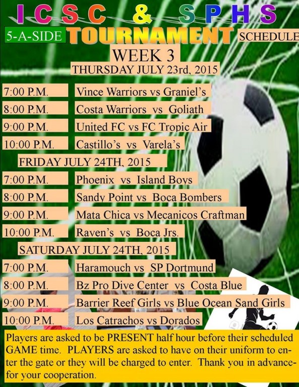 Friday, July 17th also saw four matches being played, and the first draws of the tournament. Boca Junior’s FC and Island Boys FC tied 4-4 in the first game, while in the second match Boca Bombers FC defeated Mecanicos FC in a 7-3 point game. Also drawing in their match was Phoenix FC and Raven’s FC who ended up in a 3-3 point game. In the last match of the day, Sandy Point FC narrowly defeated Matachica FC in a 3-2 point game. Cesar Salazar from Sandy Point FC was the star player, scoring a hat trick in the game.