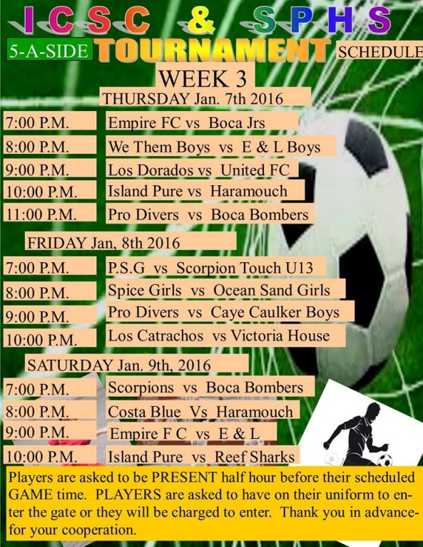 One under 13, and four senior matches, were played on Saturday, January 2nd. The footballers gave it their all to try to stay on top of the competition. In the first game, in the junior category, Inter Milan A defeated Scorpion Touch by default. The matches for the seniors started with the game between San Juan FC against Harmouch ending in a 2-2 point game. In the second game, Mata Chica faced United FC, who walked away with the victory over Mata Chica by default. Island Pure 3 narrowly beat E and L Boys with a tight score of 3-2; meanwhile Pro Divers crushed Scorpions FC with a 6-1 point game.