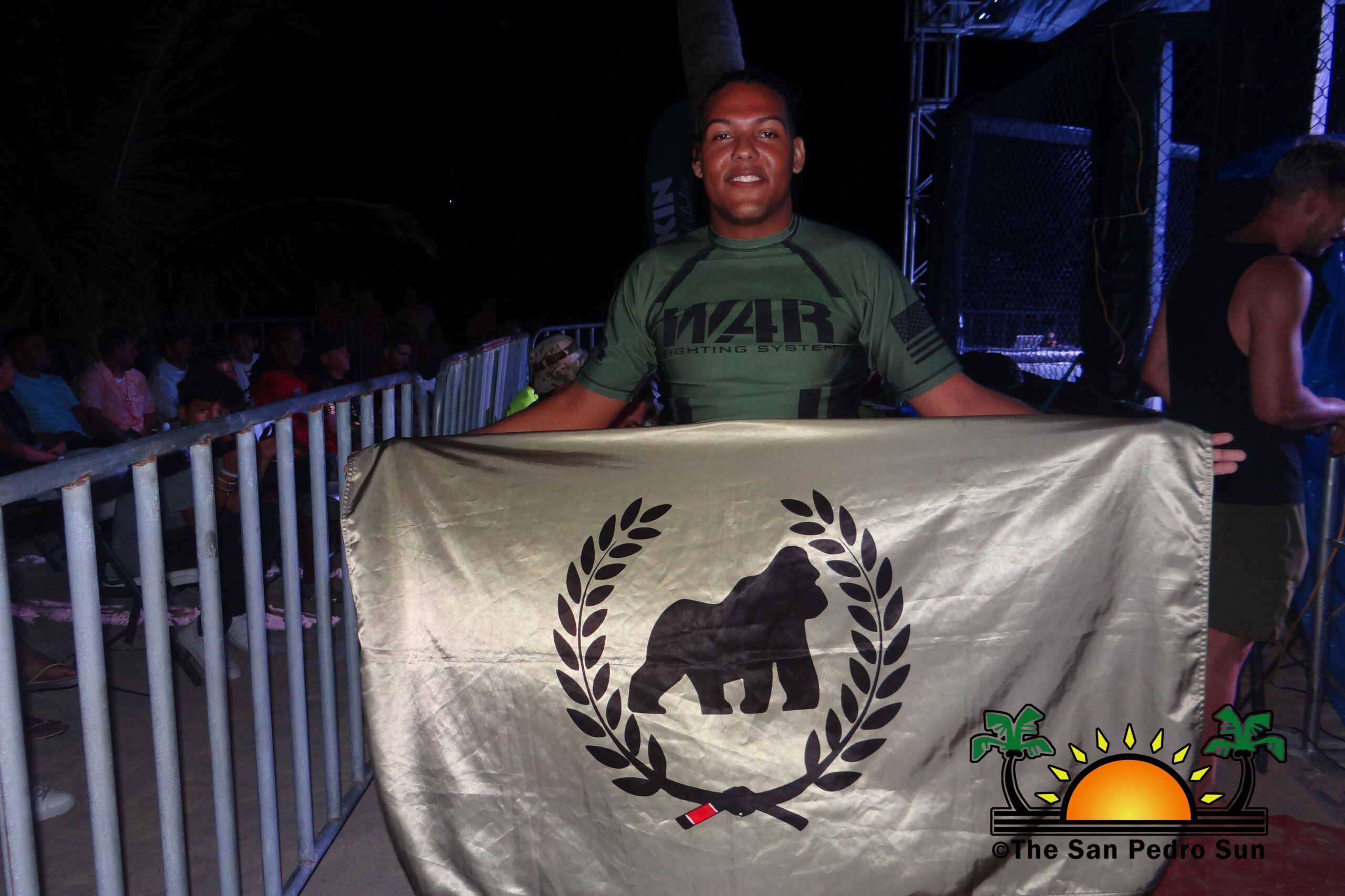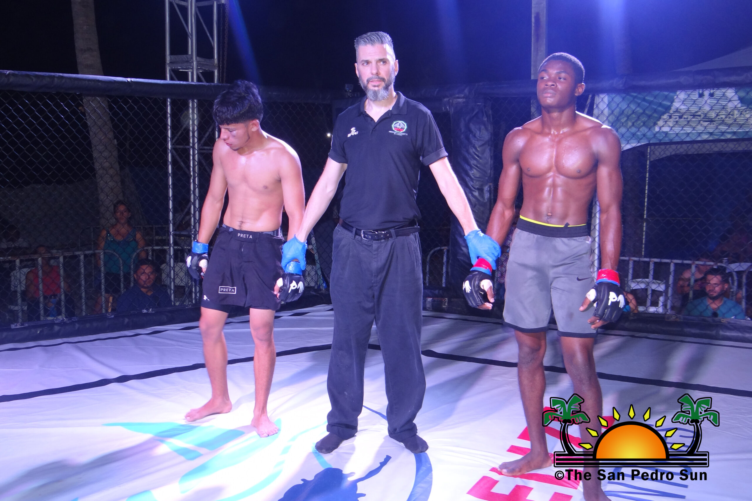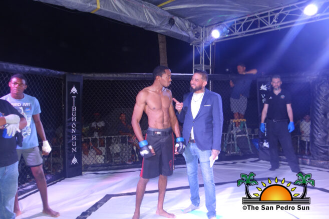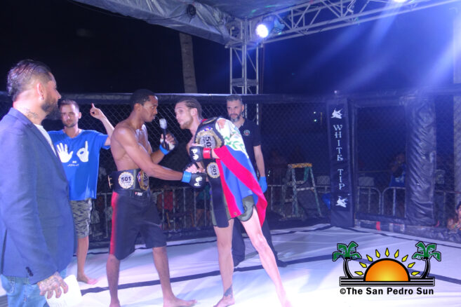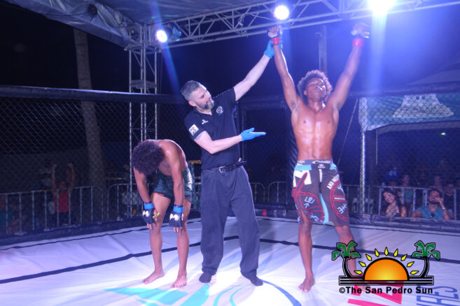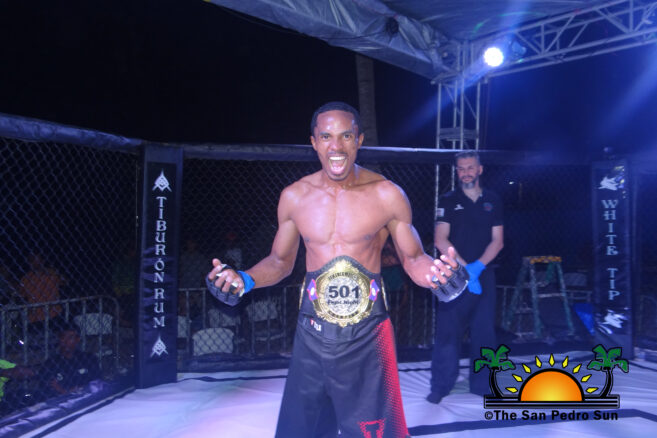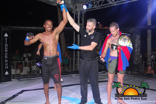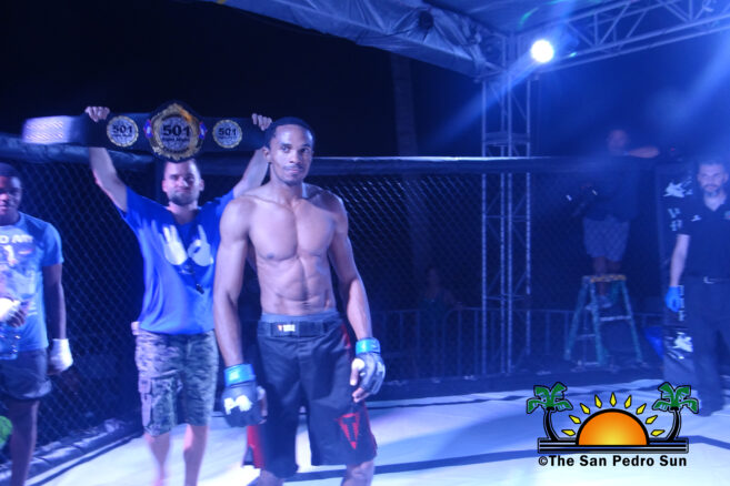 This past weekend, on Saturday, July 22nd, hundreds of spectators flocked to the beach in front of La San Pedrana Bar and Grill at the Holiday Hotel for the third edition of the Mixed Martial Arts (MMA) 501 Fight Night III: Trinity. MMA fans enjoyed an evening lined up with several fights (Jiu- Jitsu and MMA), with a main event that saw Belize City-based Rahyem Lambey take home the Featherweight title belt.