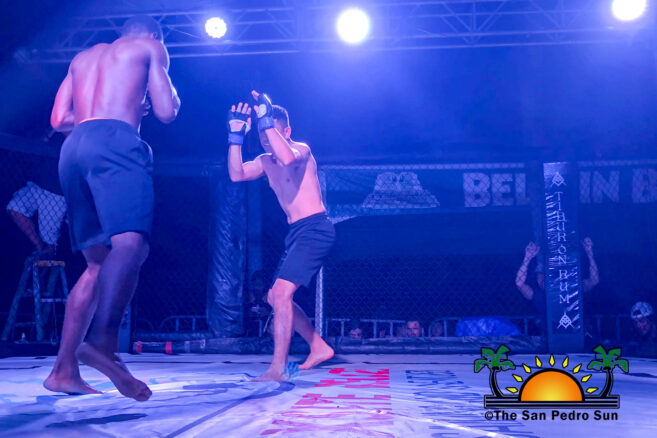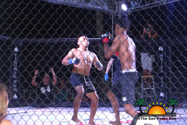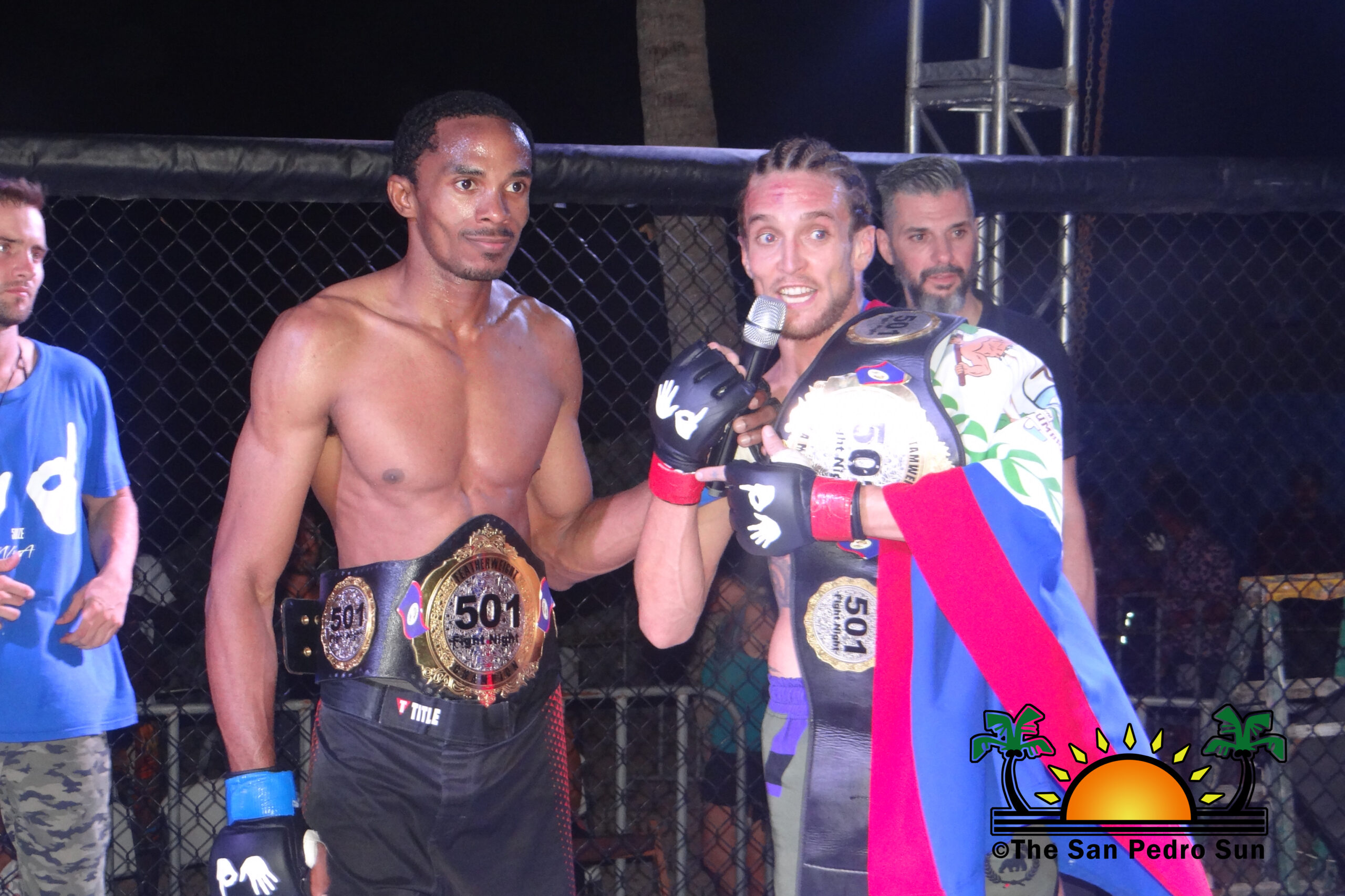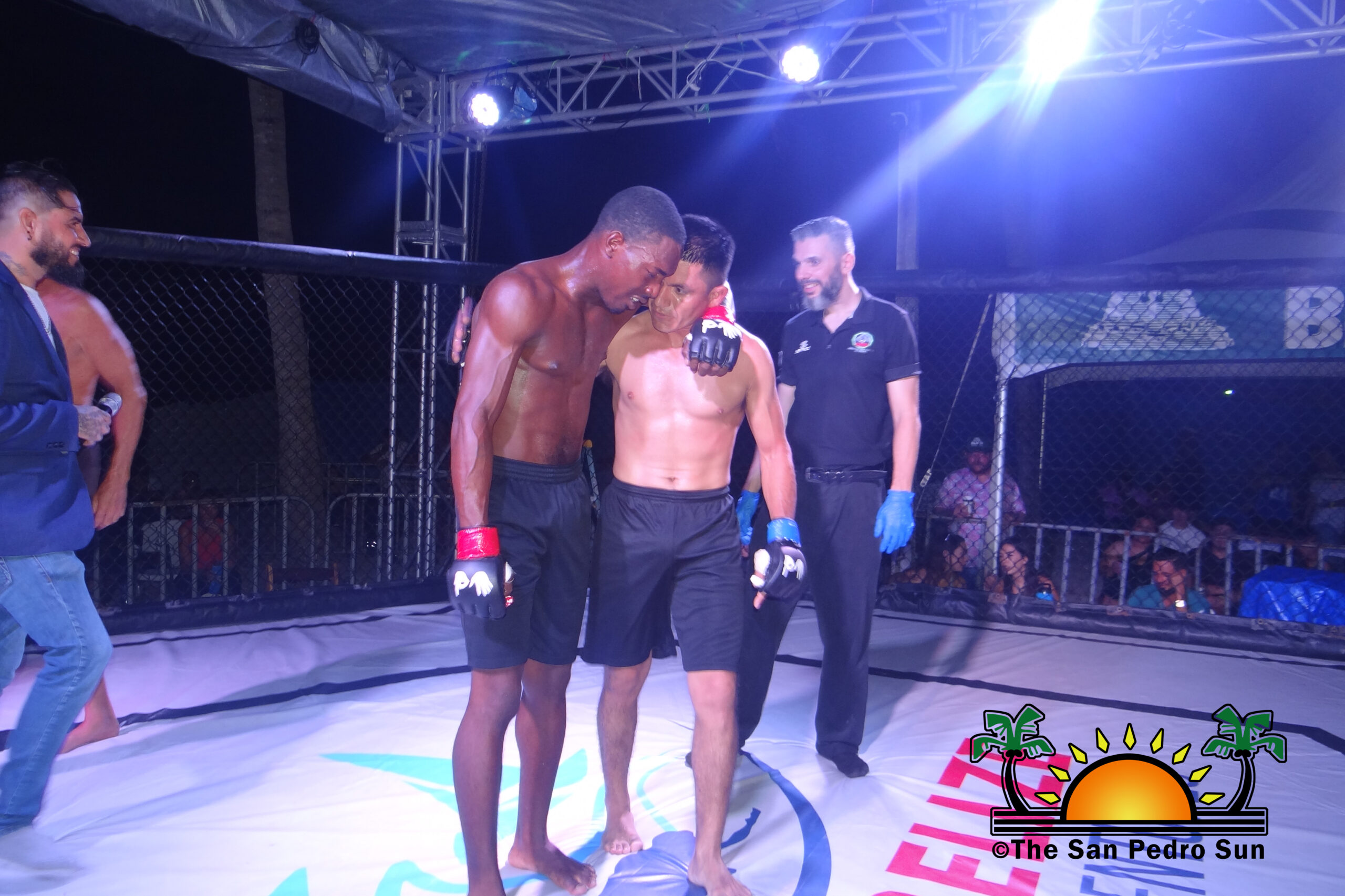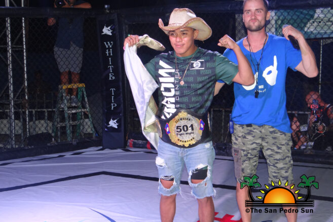 This past weekend, on Saturday, July 22nd, hundreds of spectators flocked to the beach in front of La San Pedrana Bar and Grill at the Holiday Hotel for the third edition of the Mixed Martial Arts (MMA) 501 Fight Night III: Trinity. MMA fans enjoyed an evening lined up with several fights (Jiu- Jitsu and MMA), with a main event that saw Belize City-based Rahyem Lambey take home the Featherweight title belt.