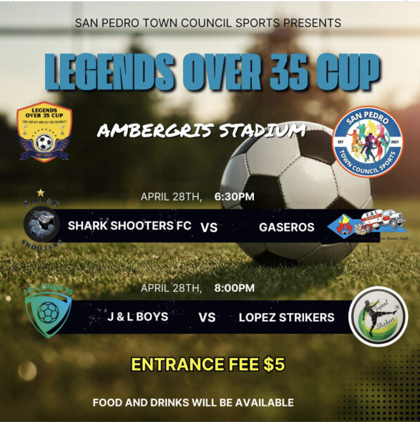 On April 28th, the San Pedro Town Council Sports kicked off a football tournament for men who are thirty-five years and older under the theme “Legends over 35 Cup,” held at the Ambergris stadium at 6:30 PM. Food and drinks were available, and a five-dollar entrance fee per person was charged.