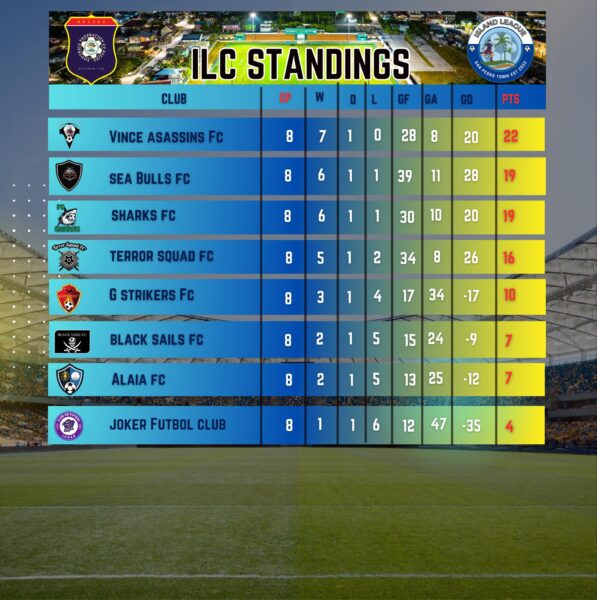 The current standings in the IFL show Vince Assassins leading with 22 points, followed by Sea Bulls FC with 19 points. Sharks FC is in third place with 19 points but a lower goal difference. Team Terror Squad is in fourth place with 16 points, while G Strikers holds fifth place with 10 points. Black Sails, Alaia, and Joker Futbol Club occupy the bottom of the standings.
