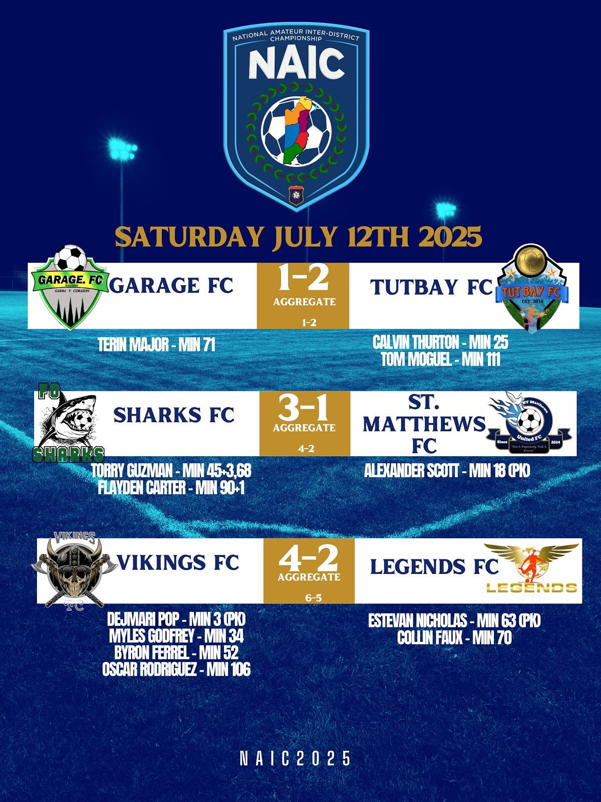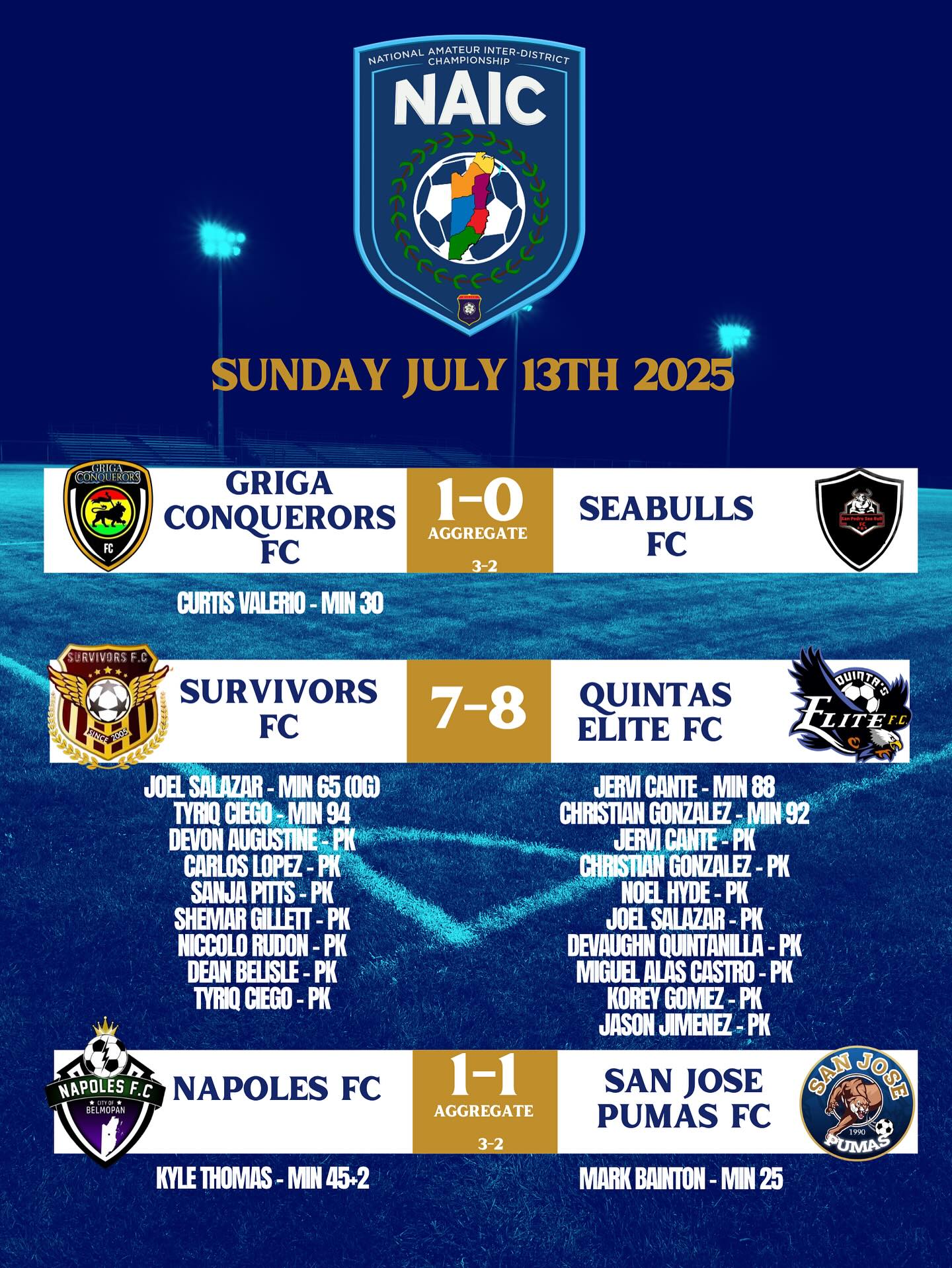 The National Amateur Interdistrict Championship (NAIC) 2025 football tournament saw the first round of eliminations, which included Sea Bulls FC, who lost 1-0 against Griga Conquerors FC. Advancing to the next round is San Pedro’s Sharks FC, who defeated St. Matthews FC 3-1.