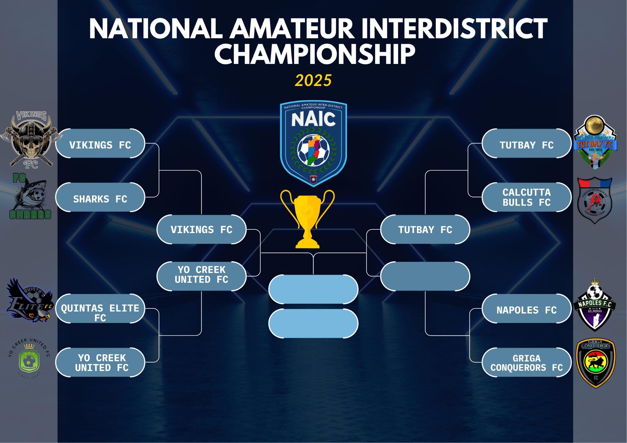 Yo Creek United FC and Tutbay FC will join Vikings FC in the next round. One final quarterfinal match between Napoles FC and Griga Conquerors FC will determine the last team to secure a spot in the semifinals.