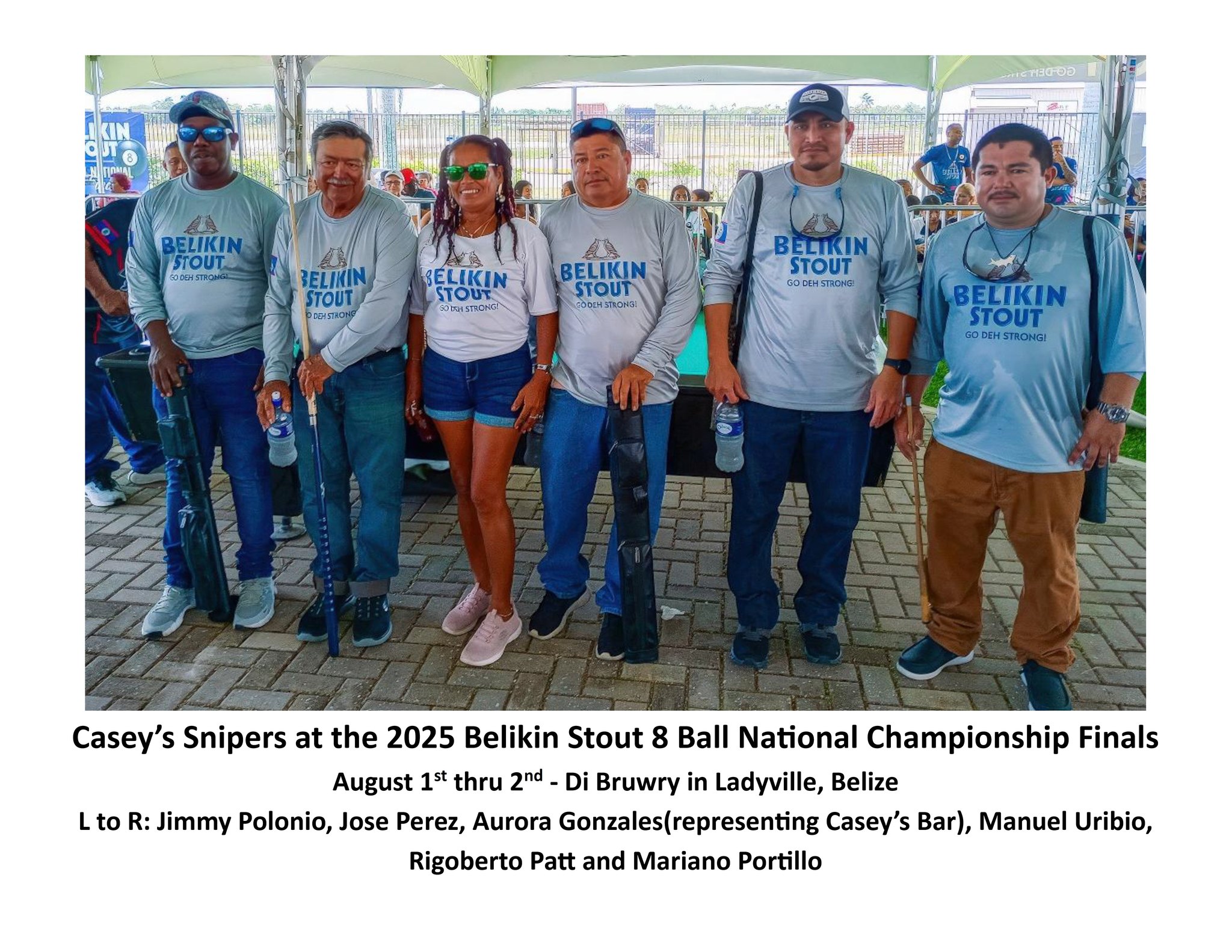 The 2025 Belikin Stout 8-Ball National Finals occurred on August 1st and 2nd in Ladyville, Belize, at Di Bruwry Restaurant and Bar. Sponsored by Belize Brewing Company and organized by the Belize Billiards Sports Federation, this 26th annual tournament brought together 13 teams from all seven districts of Belize. Representing San Pedro was Casey’s Snipers, the local champions sponsored by Casey’s Boatyard Bar and Grill.