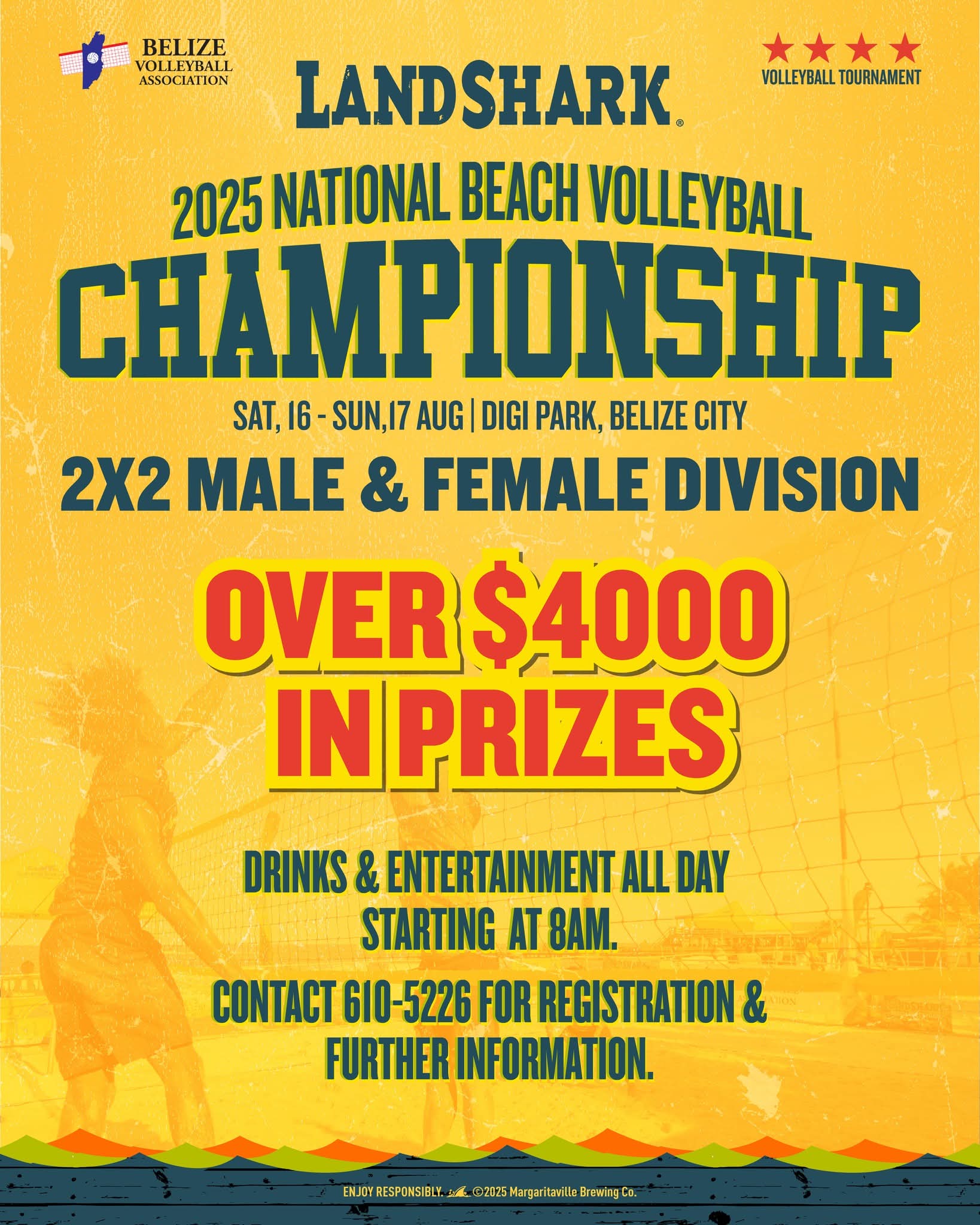 The Landshark 2025 National Volleyball Championship will be held on August 16 and 17 at DiGi Park in Belize City. The tournament is expected to draw top teams from across the country and offer over $4,000 in prize money. Fierce competition is anticipated in the male and female 2-on-2 divisions, making the San Pedro event an important step in the athletes’ preparation.
