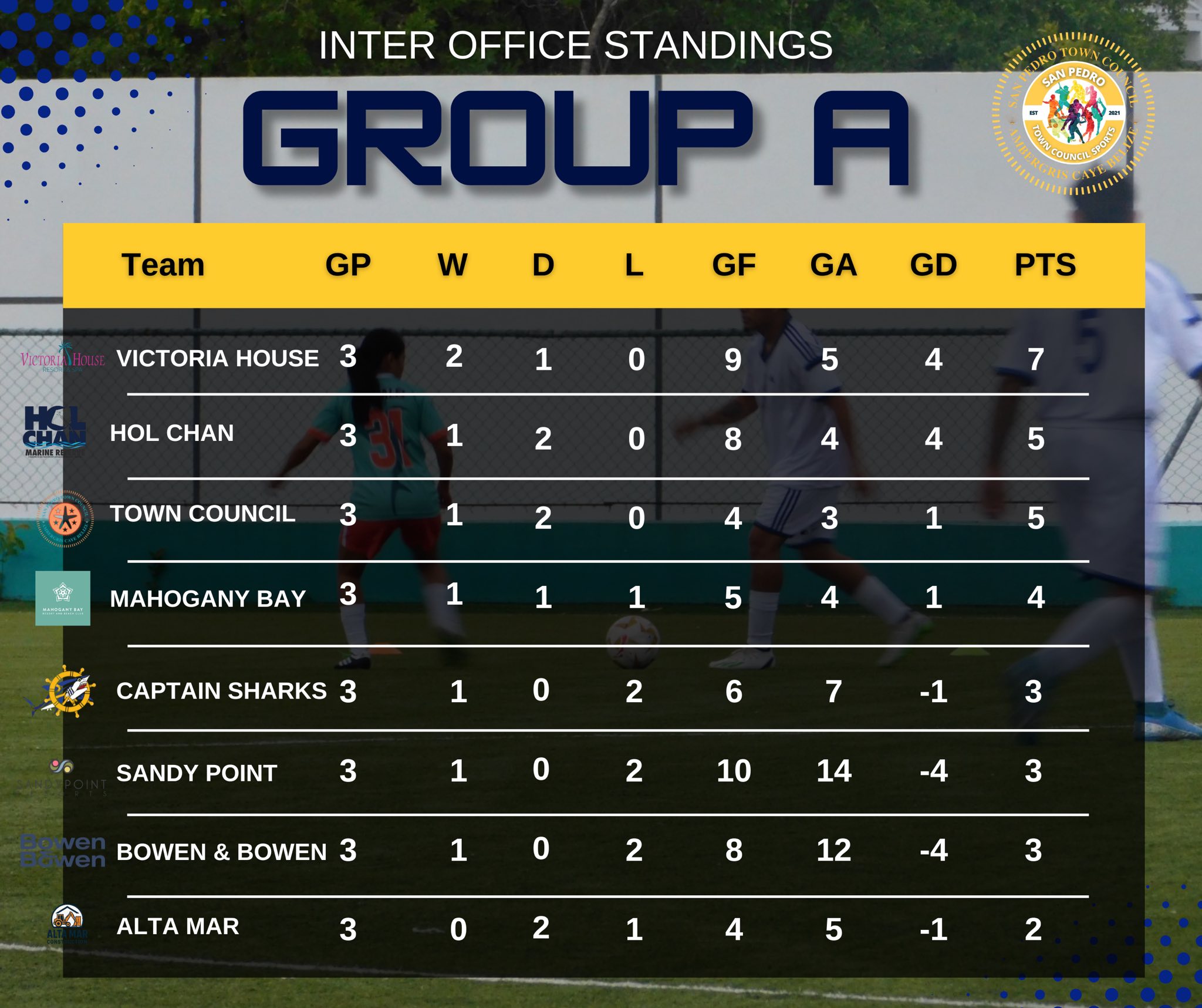 The tournament is divided into Groups A and B. After the third round, Victoria House leads Group A with seven points, followed by Hol Chan Marine Reserve and San Pedro Town Council, both with five points. Mahogany Bay sits in fourth with four points, while Captain Sharks rounds out the group with three points.