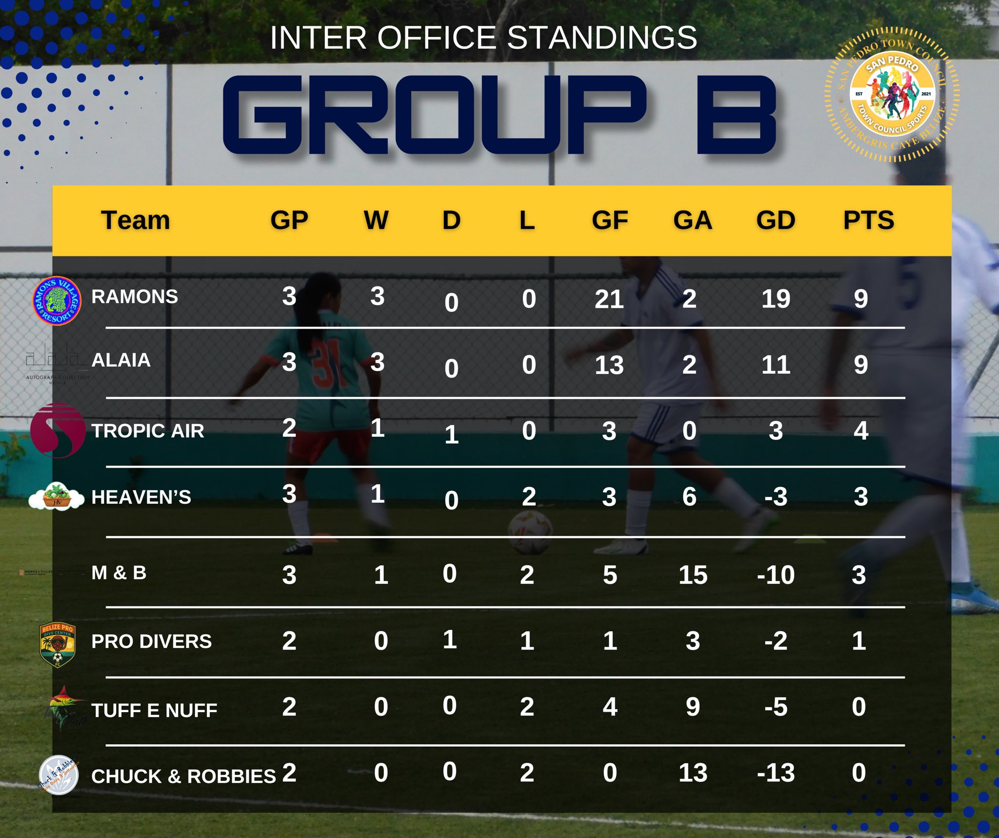 In Group B, Ramon’s Village and Alaia share the lead with nine points each. Tropic Air holds third place with four points, while Heaven’s Veggies and M & B follow with three points each.