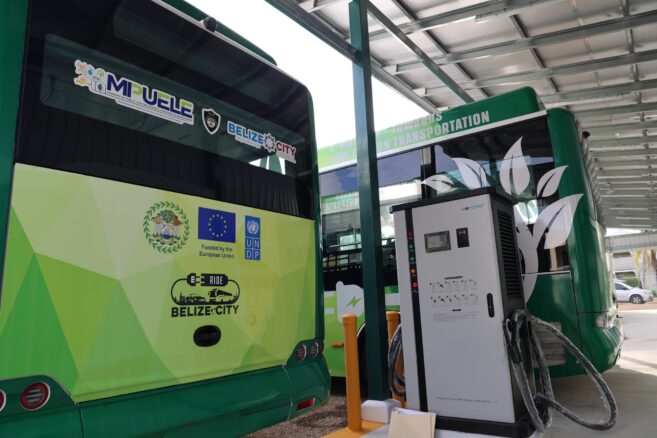 Belize City, Belize, July 19, 2024 – July 19, 2024 marks a significant milestone for the residents of Belize City as the United Nations Development Programme (UNDP), the Ministry of Public Utilities, Energy, Logistics, and E-Governance (MPUELE), the Ministry of Youth, Sports, and Transport through the Department of Transport (DoT), and the Belize City Council (BCC) with funding support from the European Union (EU), launched the e-bus service and charging depot of the E-Mobility Pilot Project.