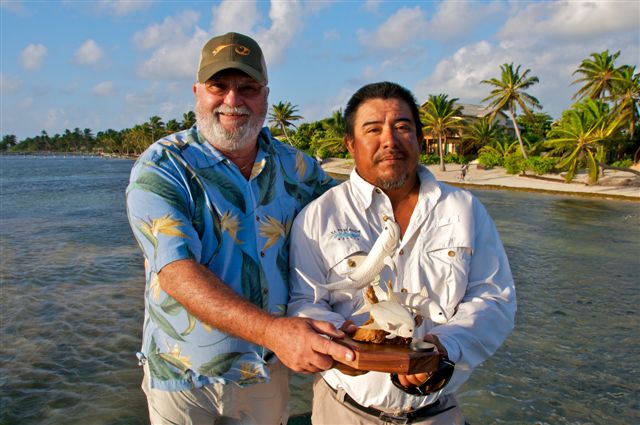 The focus of this charity event was to perform work on behalf of, and raise money for the BTT whose mission is to support research to help understand, nurture, and enhance healthy bonefish, tarpon, and permit populations. El Pescador donated US$250 for each of the 12 anglers who enter the Tagging Tournament. A total of US$3000 was given to BTT board member, Chris Peterson, at the award ceremony in the tournament grand champions’ names, Adam Marton and Anthony Cuomo. The grand champions will each become “Gray Ghost sponsors” and receive the corresponding benefits associated with that level of membership at BTT. The grand champions also received one (1) spot, with the entry fee waived, to compete in the 2013 March Merkin invitational permit tournament in the Florida Keys as well as a US$500 gift certificate from Patagonia and an exquisitely carved trophy by local artist, Robbie Guererro. The Grand Champion’s guide, Nesto received a SIMMS GORE-TEX(r) Paclite(r) jacket and pants as well as a matching trophy.