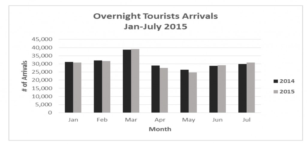 But while overnight arrivals decreased, cruise arrivals remained stable and even registered a slight overall increase pf 0.2% in the first seven months of the year. Both January and March 2015 saw increase of 16.6% and 15.8%, respectively, in cruise arrivals when compared the number from January and March of 2014. The largest figure in cruise arrivals was in March with 133,482. All other months (February, April, May, June and July) registered a decrease when compared to 2014.