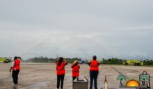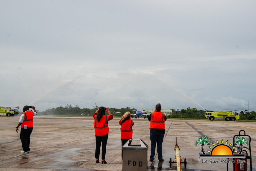 Right on scheduled time, the sound of Flight #827’s arrival had everyone moving outside to witness the blue craft come down the runway. The plane glided in under the traditional water arch, and despite earlier rains, the warm Belizean sun peeked and spread its rays on the aircraft in welcome. From the cabin windows, the captains waved both the Belize and US flag, and below, the gathered crowd cheered.