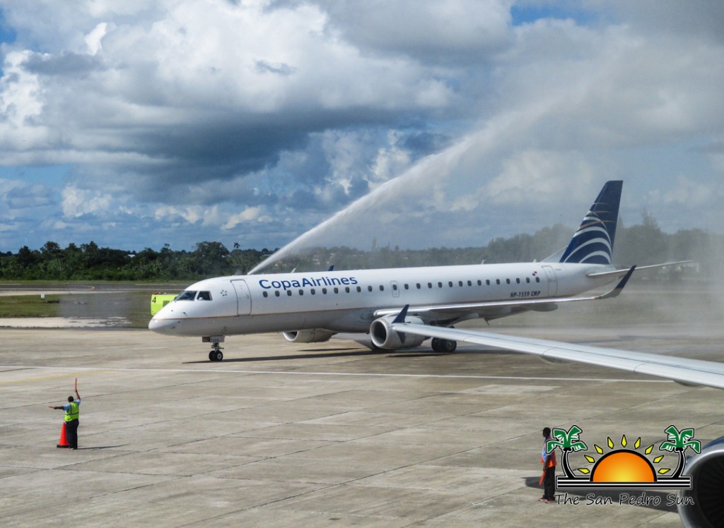 On Tuesday December 8th as announced earlier this year, Copa Airlines officially made their inaugural flight to Belize’s Phillip Goldson International Airport (PGIA). Copa Flight 281, travelling from Hub de las Americas Panama City, Panama landed on Belizean soil at 12:49PM carrying a total of 92 passengers. The flight was greeted by water salutes and an official inaugural ceremony. Present to witness the historic moment were Minister of Tourism and Civil Aviation, Manuel Heredia Jr.; Ambassador of Panama to Belize, Marta Irene Boza; Director of Sales for Copa Airlines, Adolfo Sen; Managing Director of the Belize Airport Concession and Co. Jorge Espat, Director of the Belize Tourism Board, Karen Bevans and a host of media and invited guests.