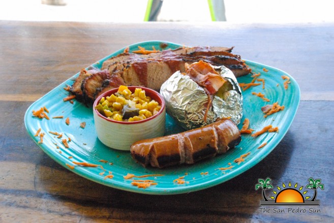 Of course, The San Pedro Sun had to try out the Texas BBQ – and no, it’s not like our Belizean barbecues. Locally sourced brisket is seasoned and smoked to tender perfection, then sliced and served with sides like jalapeño and corn salsa and baked potato, with some sausage on the side (the Lonestar platter).