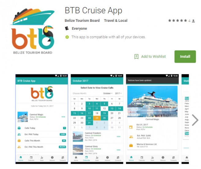 Belize’s cruise tourism operators can now have real-time notifications and access to all the information about their industry: ship calls, passenger arrivals, and all other statistics – past, present and future, at their fingertips with a new, free BTB Cruise App, which they can download to their smartphone or tablet from the Google Play store or Apple store.