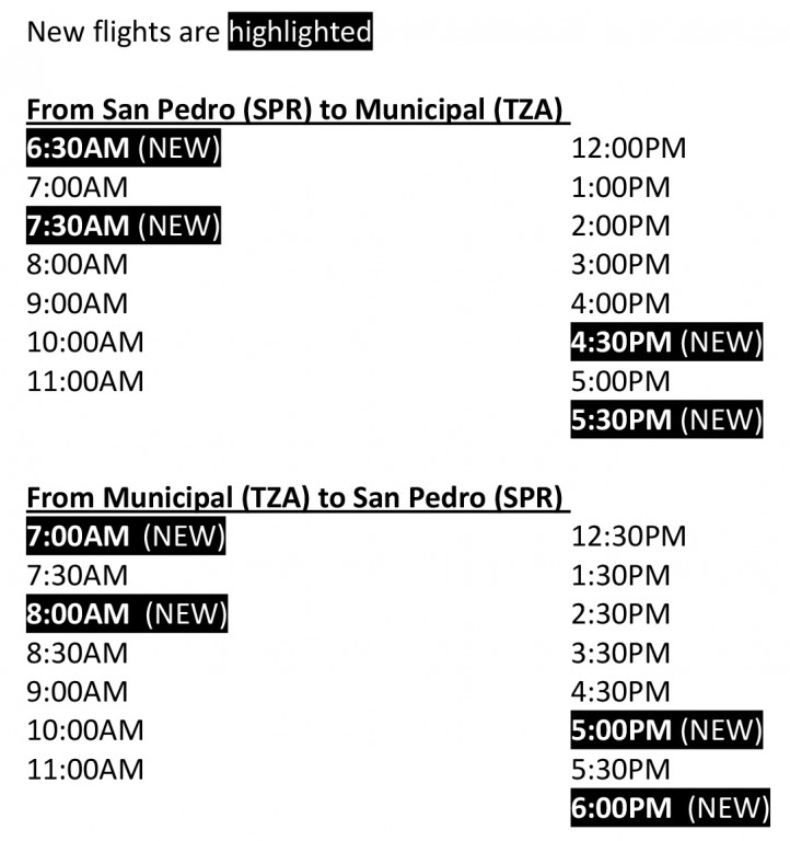 The new San Pedro – Belize Municipal schedule is as follows (all flights are daily).
