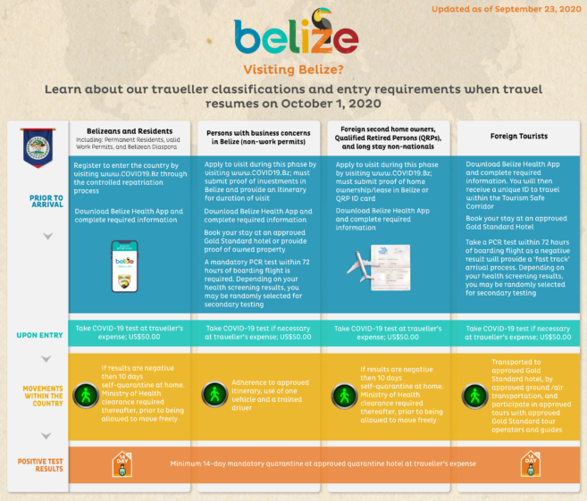 These people will need to get approval to travel to Belize after emailing a copy of the bio page of their passport, travel itinerary, and purpose of their travel to [email protected]. In the case of persons with business concerns in the country, they must stay at an approved Gold Standard hotel or produce proof of owned property. They must bring with them a PCR test done 72 hours prior to their trip.