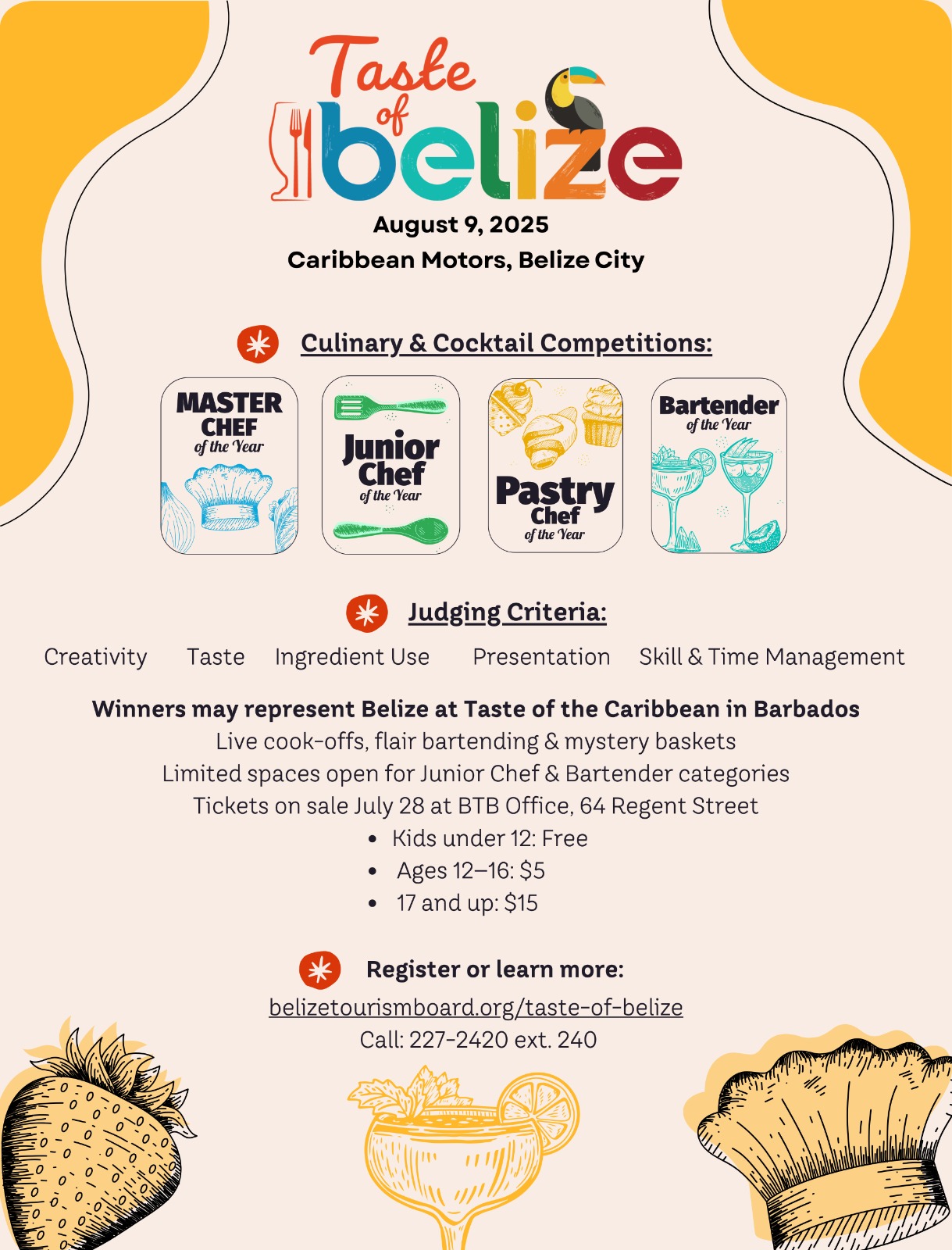 Belize City, July 21, 2025 — The Belize Tourism Board (BTB) is delighted to announce the return of Taste of Belize, our signature culinary and bartending event, set for Saturday, August 9, 2025, at Caribbean Motors, Belize City. The event will feature exciting competitions to award Belize’s best Master Chef, Junior Chef, Pastry Chef, and Bartender.