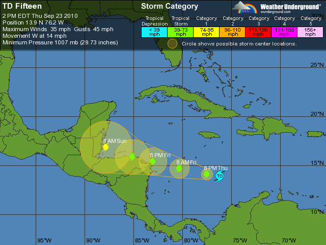 Tropical Depression 15 forms over the South Central Caribbean Sea. Watches and warnings issued for portions of Central America. The center of Tropical Depression 15 is located near latitude 13.9 North, Longitude 76.2 West. The depression is moving toward the West near 15 MPH and this general motion is expected to continue for the next 48 hours. Maximum sustained winds are near 35 MPH with higher gusts with strengthening to occur. The Depression could become a Tropical Storm later tonight or Friday.