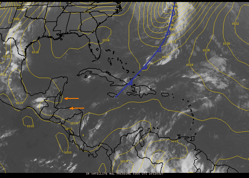 The feature of interest this week will continue to be a relatively stable and fresh Easterly to South-easterly airflow over the NW Caribbean, generated by a weakening Atlantic High and a broad low pressure system over Texas and Mexico. An active cold front system will move off the Texas Gulf coast at the end of the period on Monday, and will move vigorously south eastwards across the Gulf, reaching Yucatan and Belize by late Tuesday of next week.
