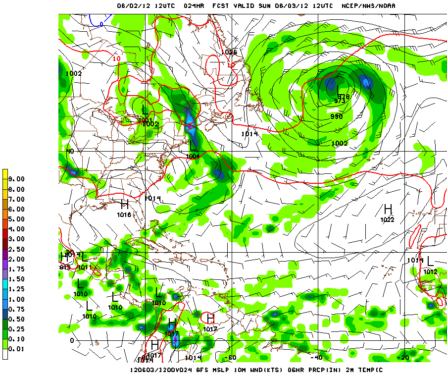 Figure 2 shows the GFS model 132-hr projected vorticity pattern at 5,000 feet valid for Thursday evening, June 7, 2012, showing a trough of low pressure extending across the eastern Gulf of Mexico to coastal waters of Belize and the surge of strong low-level winds in the central and western Caribbean. This surge will enhance the convective activity generated by the low pressure trough in the NW Caribbean on Friday through most of the upcoming weekend.