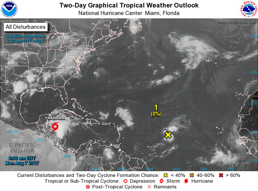 The National Emergency Management Organization (NEMO) in collaboration with the National Meteorological Service hereby informs the general public that Tropical Storm Franklin is now located near17.1 North Latitude and 84.2 West Longitude or some 266 miles east south east of Belize City; 255 miles away from San Pedro and 290 miles from Corozal Town. The barometric pressure is 1005 milibars (mb) Franklin is continues to move to the West-North-West at 13 mph with maximum sustained winds near 45 miles per hour. There is a possibility that Franklin could strengthen and reach Hurricane strength just before making landfall.