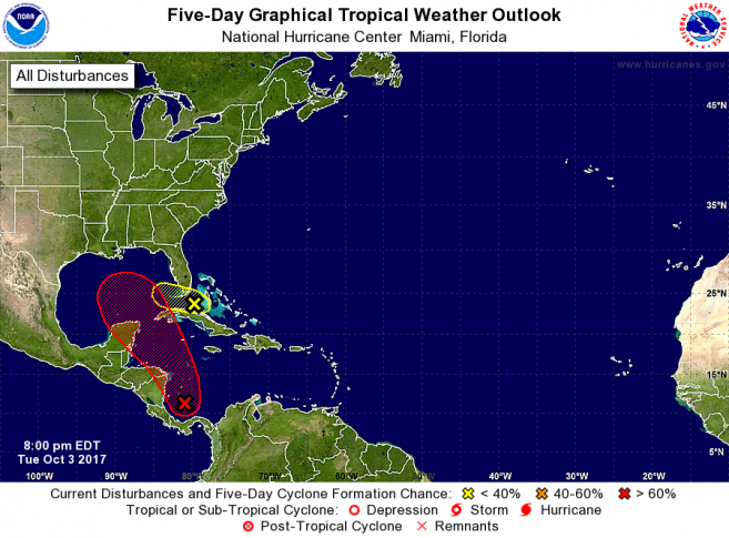 NEMO in collaboration with the National Meteorological Service hereby informs the general public that Tropical Depression Sixteen (16) with maximum sustained winds of 35 miles per hour recently formed off the coast of Nicaragua. TD 16 is located at 12.2 North Latitude and 81.9 West Longitude. It is moving due northwest at 7 miles per hour. It is forecasted to continue move in that direction. If it maintains its projected path based on that forecast it is expected to become a Tropical Storm and by Friday, 6th October 2017 it is expected to be east of Belize, or directly in front of us.