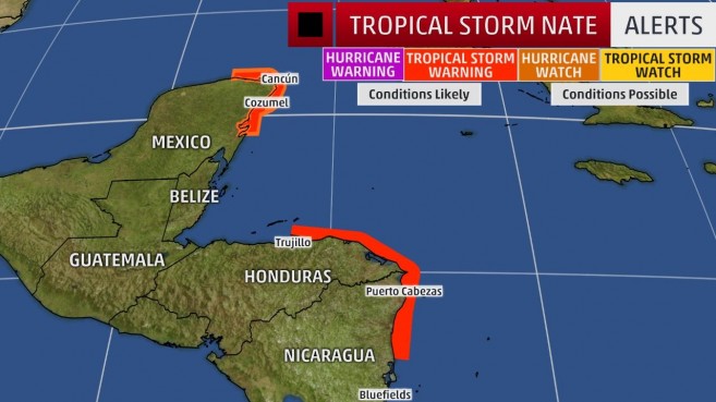 NEMO in collaboration with the National Meteorological Service hereby informs the general public that Tropical Storm Nate, with winds of 40 miles per hour is located near 14.3 North Latitude and 83.7 West Longitude or approximately 550 miles south east of Belize. Nate is moving to the northwest at 8 miles per hour. The current track shows the centre of the storm in the warm waters off the coast of Belize. The stronger winds are expected to be east of Belize, over the sea. Nate is forecasted to reach the Yucatan Peninsula and head into the Gulf of Mexico by Friday night or Saturday. The main threat to Belize is thunderstorms and heavy rainfall which will continue to cause localized flooding to streets, low-lying roads, bridges, and flood prone villages, towns, and cities. Nate is expected to be directly in front of Belize by tomorrow and it is likely that a Tropical Storm Watch will be issued for the country.