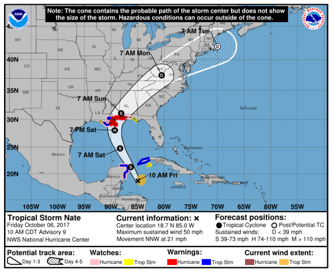 NEMO and the Met Service hereby informs the public that as at 6:00 a.m., local time Tropical Storm Nate with winds of 45 miles per hour was located near 17.8 North Latitude and 84.8 West Longitude or approximately 240 miles East of Belize. The pressure was at 996 milibars. Nate is moving to the north-northwest at 14 miles per hour. The main threat to Belize is expected to be mostly thunderstorms and heavy rain which are causing localized flooding. Rainfall amounts expected to increase along the coast and north today TS Nate moves east of Belize as it moves into the Gulf of Mexico later today.