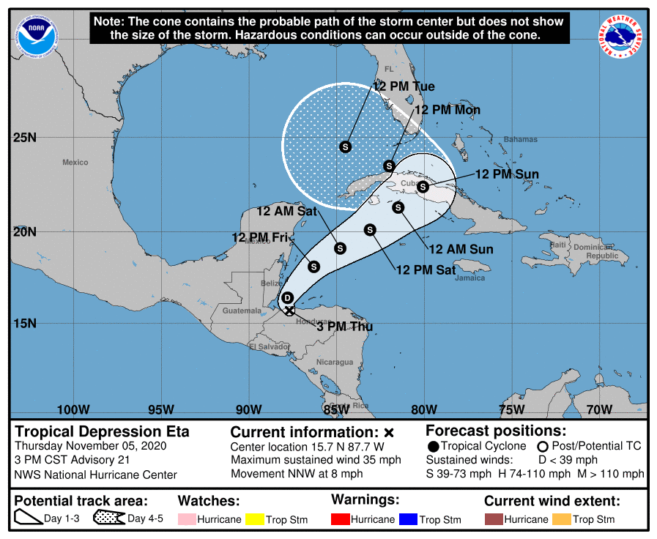 Its slow, five-mile-per-hour movement meant rains caused mudslides ahead of her arrival to Honduras, which has registered 13 fatalities. As Eta made her slow movement through these countries, her heavy rains caused devastating floods from Panama (eight missing) to Guatemala (35 dead). Its trajectory now has Eta emerging on the Caribbean coast and along Belize’s waters as a Tropical Depression.