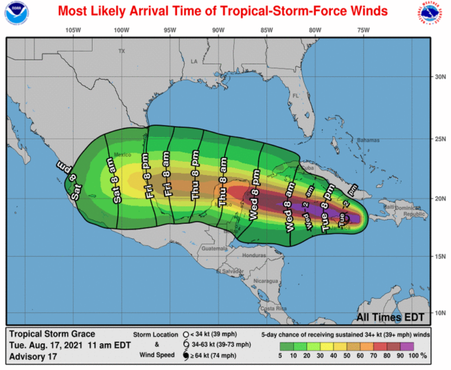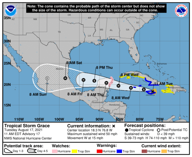 Tropical Storm Grace in the Caribbean Sea is forecast to strengthen into a hurricane tomorrow, Wednesday, August 18th, before reaching the Yucatan Peninsula, Mexico’s eastern coast. The potential hurricane does not pose a direct threat to Belize but will bring rain to the country beginning Wednesday afternoon and increasing at night through Thursday midday.