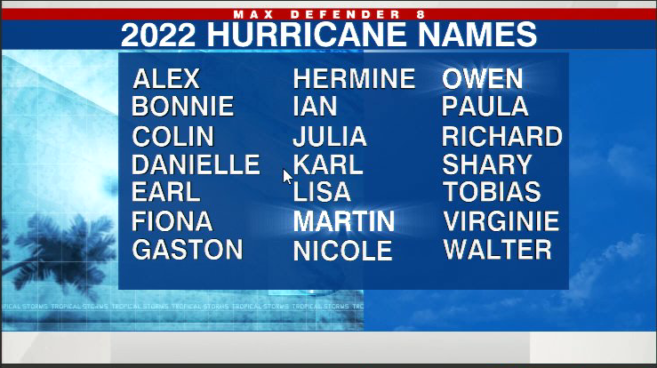 These are the names for the storms this year: Alex, Bonnie, Colin, Danielle, Earl, Fiona, Gaston, Hermine, Ian, Julia, Karl, Lisa, Martin, Nicole, Owen, Paula, Richard, Shary, Tobias, Virginie, Walter