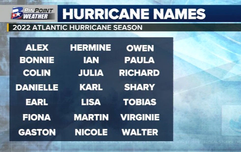 These are the names for the storms this year: Alex, Bonnie, Colin, Danielle, Earl, Fiona, Gaston, Hermine, Ian, Julia, Karl, Lisa, Martin, Nicole, Owen, Paula, Richard, Shary, Tobias, Virginie, Walter