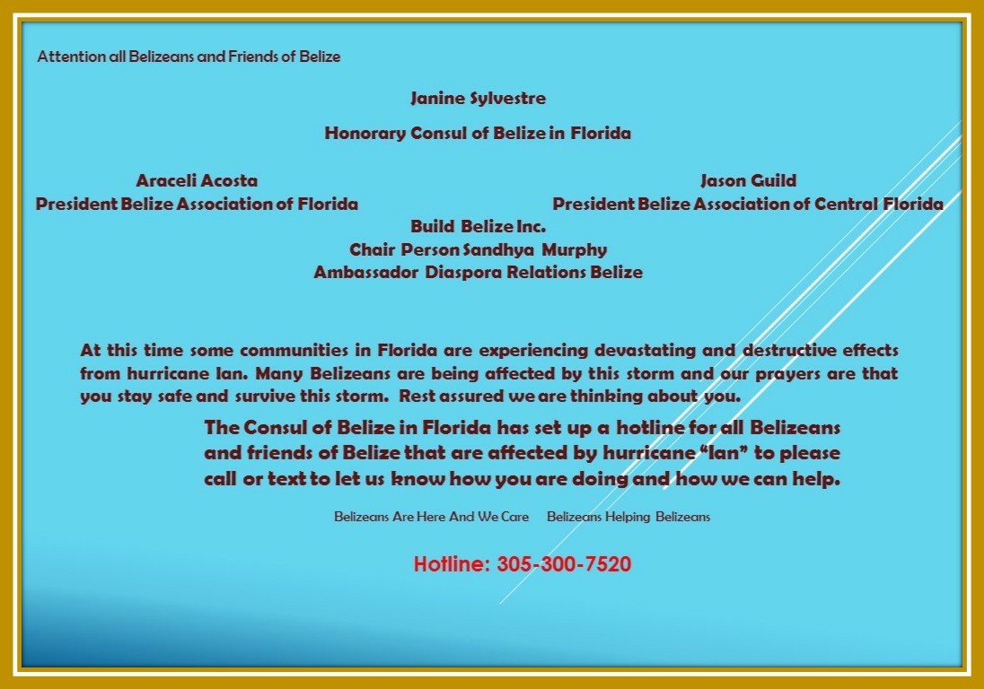 The Honorary Consul of Belize in Florida, headed by Janine Sylvestre, said they are ready to follow up with Belizeans affected by Hurricane Ian. The Consul is working with the Belize Association of Florida, the Belize Association of Central Florida, and another entity called Build Belize Inc. The Consul plans to work with these organizations and assist Belizeans affected in any way possible. They have established a hotline for Belizeans and friends of Belize affected by Hurricane Ian to call or text 305-300-7520.