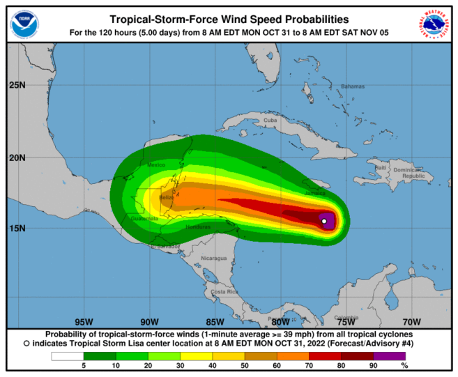 The National Meteorological Service of Belize and the National Emergency Management Organization (NEMO) hereby inform the public that at 10:00 a.m. (local time), Tropical Storm Lisa was located near latitude 15.5N, longitude 77.3W or about 735 miles East by South of Belize City. Lisa was moving to the west at 12 mph with maximum sustained winds of 40 mph and a minimum central pressure of 1003 mb. Lisa is to continue on a general west to west-north-westward track for the next few days. On this forecast path, the system will move south of Jamaica today, north of the northern coast of Honduras on Tuesday, and then approach the coast of Belize late Wednesday with landfall possible on Belize late on Wednesday night or early Thursday morning. Strengthening is expected and Lisa is expected to be a category 1 hurricane by landfall on the country.