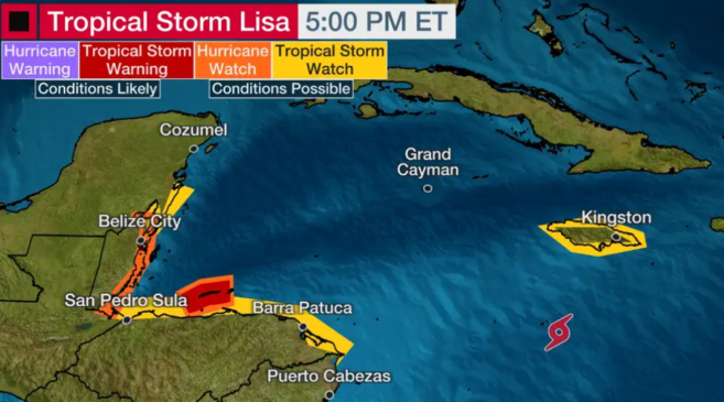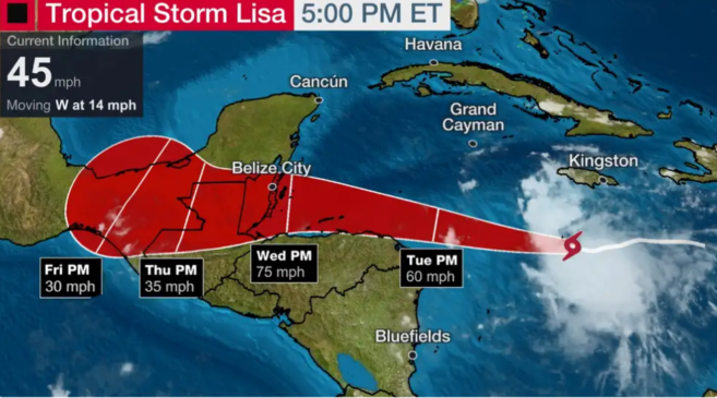 A hurricane watch continues for the entire coast of Belize after the formation of Tropical Storm Lisa in the Caribbean Sea. As of 3PM, the storm continued moving west at 14 miles per hour (MPH) with maximum sustained winds of 45 mph. People on Ambergris Caye have started to prepare for what could be Hurricane Lisa expected to make landfall in Belize late Wednesday.