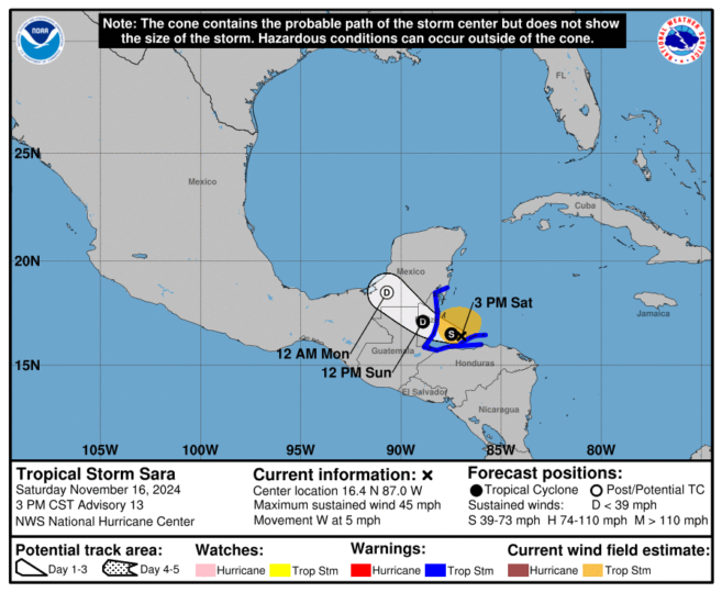 Tropical Storm Sara is approaching Belize, bringing heavy rainfall that poses a flood risk to low-lying areas nationwide. A tropical storm warning is in effect for Belize and the Cayes. Currently, the storm is hovering near the coast of Honduras, moving west at four miles per hour with maximum sustained winds of 45 miles per hour. The forecast predicts Sara will land in southern Belize on Sunday, November 17th, with maximum winds of 50 miles per hour and higher gusts. In San Pedro Town on Ambergris Caye, the inclement weather has resulted in heavy rainfall that has flooded streets and neighborhoods and contributed to beach erosion.